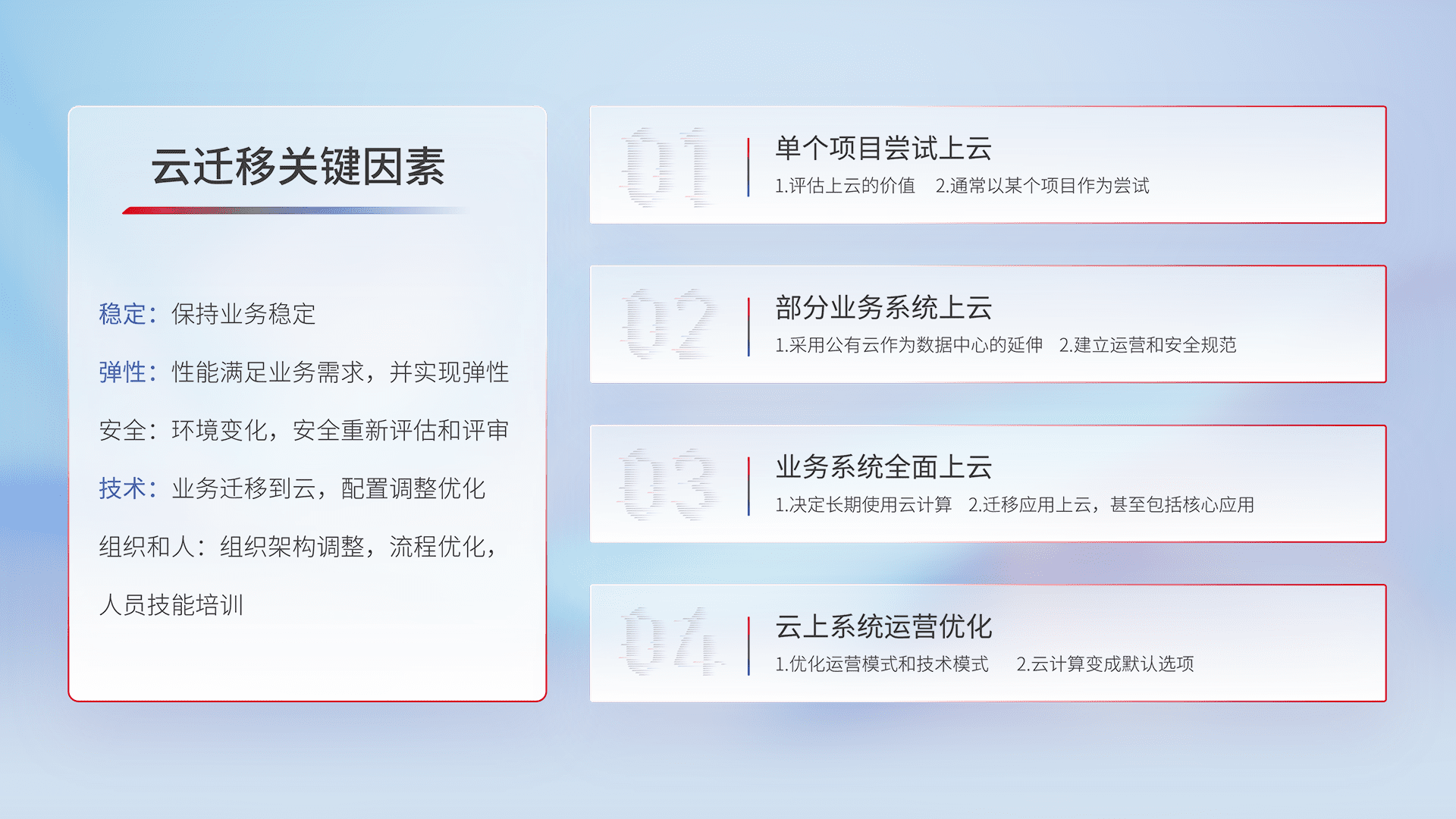结合实际业务,,,从规划设计、、、云平台选型、、、云原生改造、、、数据迁移、、集成交付,,,,迁移全过程为客户识别最佳上云路径,,,做好风险识别管理,,设计网络架构、、、身份权限、、、安全审计合规、、操作审计、、、、日志审计、、、监控告警策略、、、、多站点容灾设计等,,对云上基础设施进行整体规划,,,,提升IT治理水平,,,以满足弹性、、、高可用、、高性能的需求。。